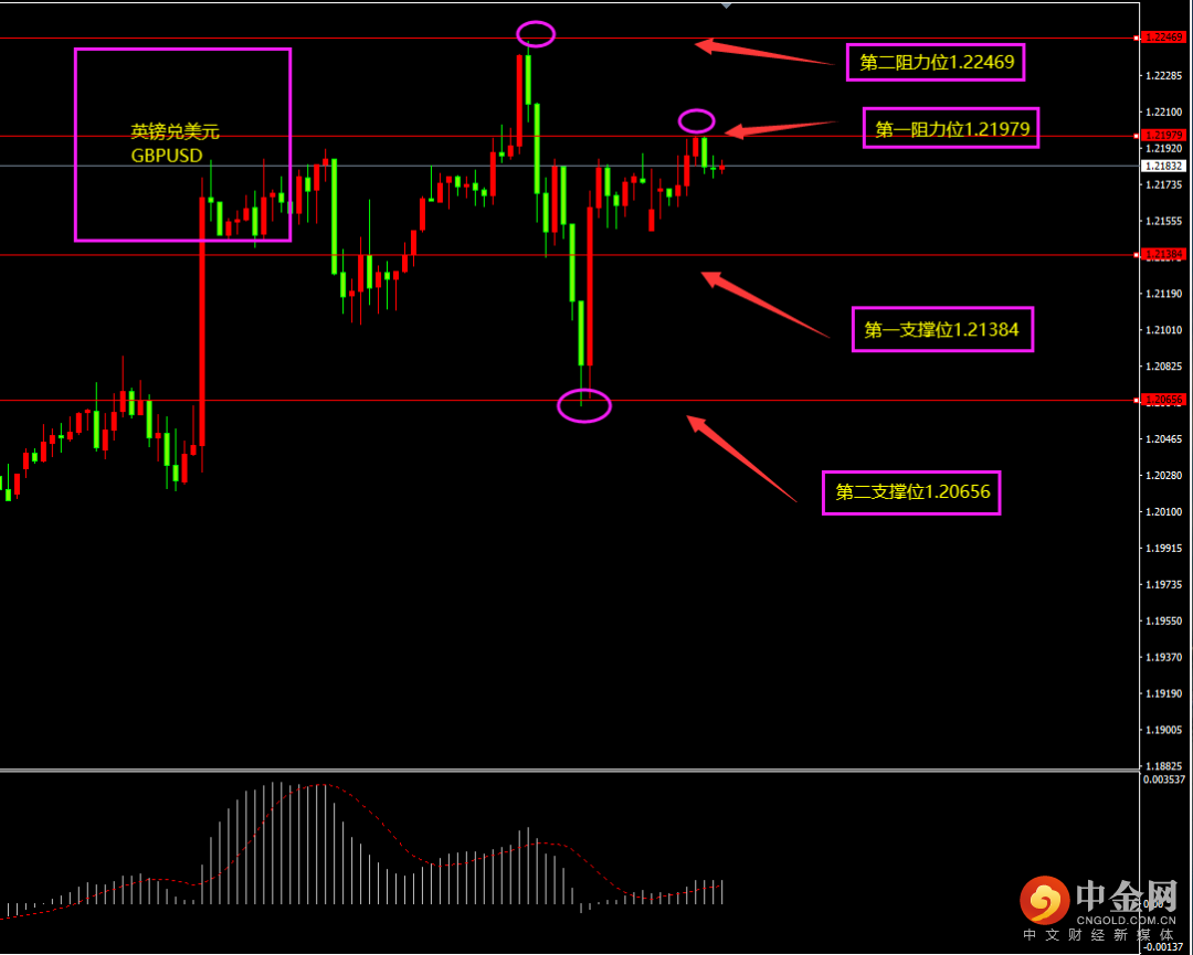 天图欧元收阳线,价格有所冲高,但实体部分较小,多头力度不强,短期下影线较长,且MACD位于0轴之下,空头仍在,日内更多以逢高看空为主。小时图欧元期间高位震荡,MACD有所下滑,多头有所减弱,短期上方有大阴线回落,空头有所增强,日内更多以震荡以及震荡下行为主.(仍有冲高可能)