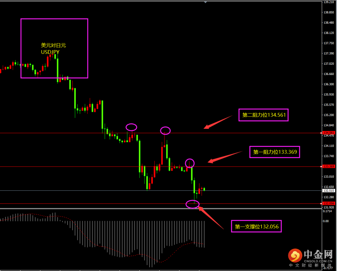 天图美日收阴线,价格有所回落,空头自连续下行之后,得到大量释放,短期MACD位于0轴附近,多空开始进入调整,日内更多以偏震荡为主。小时图美日期间连续阴线回落,价格创新低而MACD能量未创新低,形成“底背离”,短期底部有部分阳线产生,多头有所增强(并非强势),日内更多以震荡带有一丝上行为主。