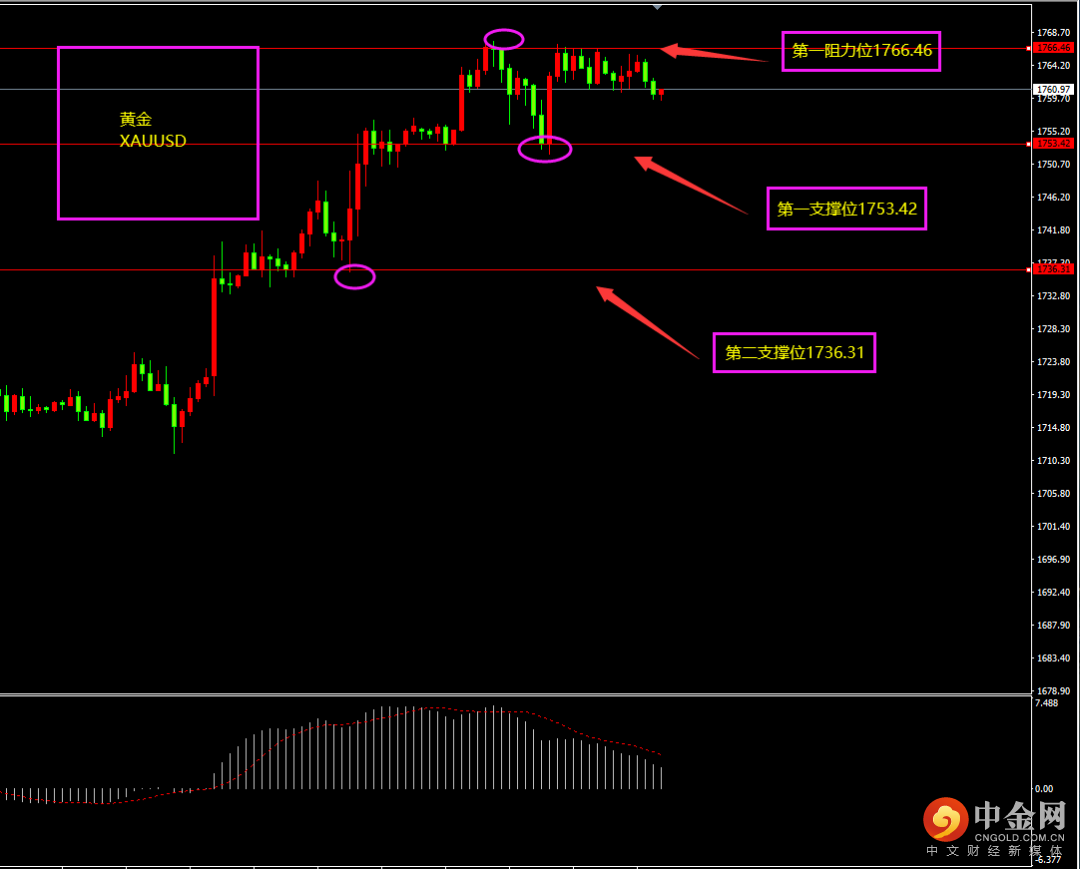 天图黄金收大阳线,价格再度冲高,多头有所增强,短期MACD逐渐上移,空头减弱,且下方未形成大阴线下滑,空头不强,日内继续以震荡以及震荡上行为主。小时图黄金期间高位震荡,期间虽有连续阴线回落,但并未大幅下行,且MACD位于0轴之上,多头仍在,日内继续以逢低看多为主。