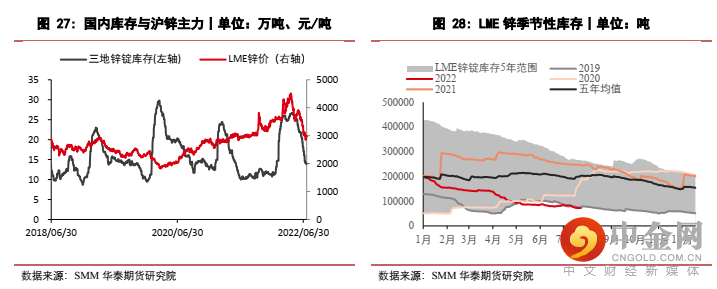 海外方面,地缘政治带来的能源风险仍将延续,欧洲冶炼厂受高成本压力影响,短期内难以复产。需求方面,出于流动性收紧以及高通胀的双重压力,海外需求或承压回落。但考虑到LME锌锭全球总库存处于历史低位,在低库存和高波动的能源价格背景下,市场对后续海外锌锭供应仍相对悲观,伦锌价格有一定支撑。