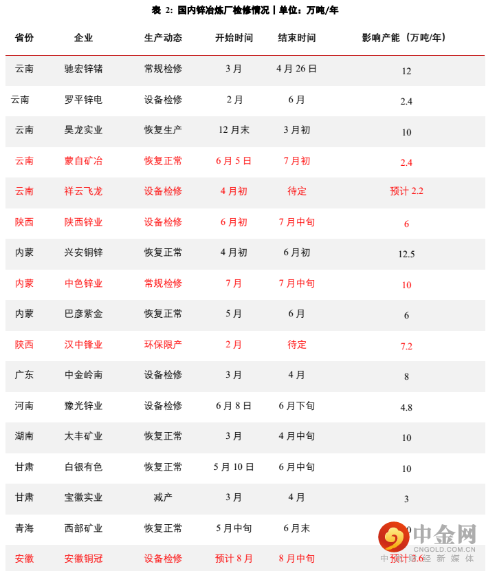 冶炼端:一方面,锌冶炼企业受副产品硫酸价格下跌等因素影响,冶炼厂利润进一步压缩,部分冶炼厂出现检修;另一方面原料供应仍相对偏紧,预计短期供给弹性依然很难释放,7月国内精炼锌产量或维持在48.5-49.5万吨左右。