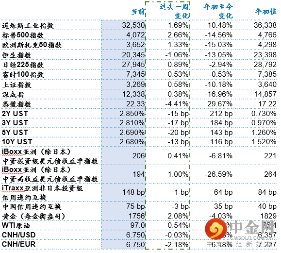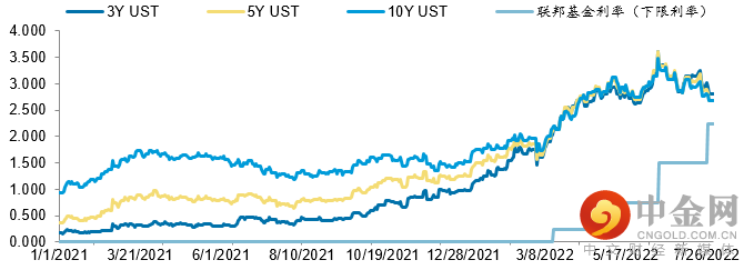 上周,美联储将基准利率上调75个基点,符合市场预期,加息后联邦基金利率目标区间达到2.25%-2.50%区间。6-7月累计加息达到150个基点,幅度为1980年代初以来最大。FOMC会议表示,将高度关注通胀风险,坚定致力于让通胀回归其2%的目标。上周四晚间公布的美国二季度GDP年化环比下降0.9%,远低于预期的增长0.4%。美国财政部长珍妮特·耶伦表示,数据显示美国GDP连续两个季度萎缩,并不证明美国目前处于衰退之中。