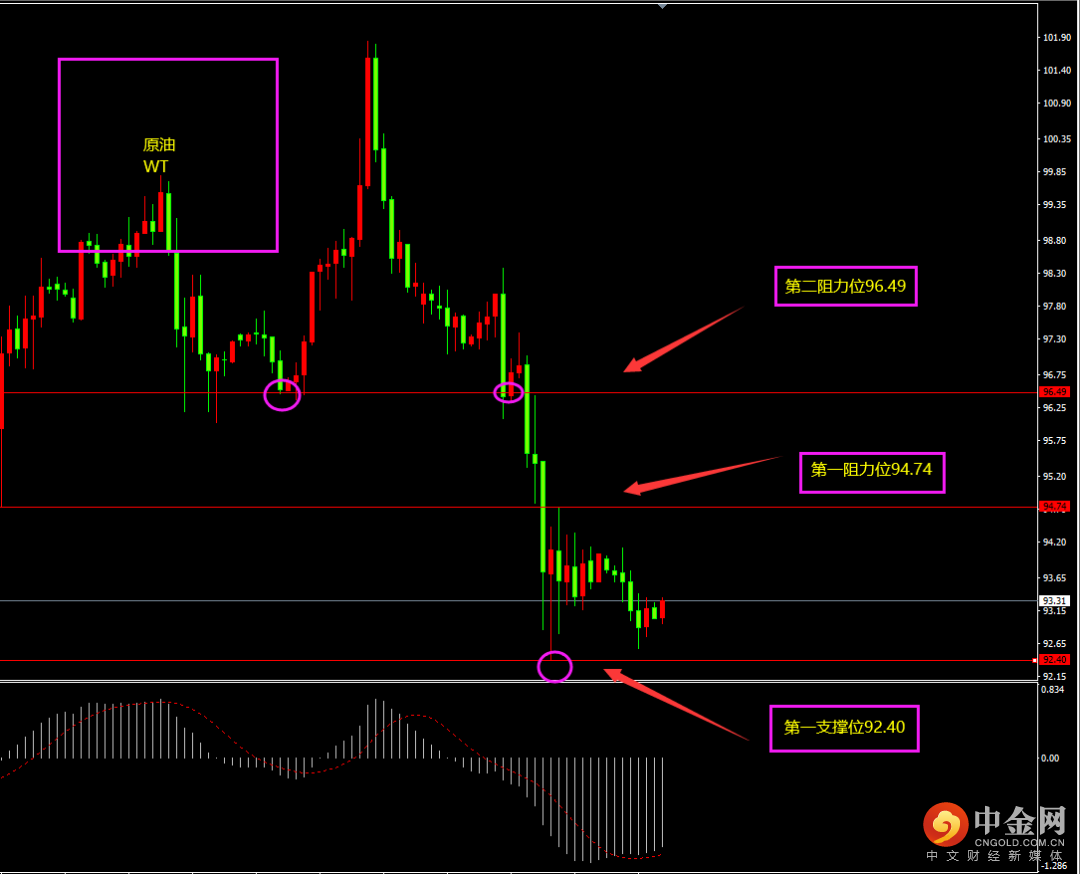 原油昨日收大阴线,自上影线较长之后,价格大幅回落,空头得到大幅释放,目前大方向仍看涨,短期处在调整阶段,日内更多以震荡带有一丝上行为主。小时图原油期间连续阴线下滑,MACD位于0轴之下,空头占优,短期下方有部分阳线产生,多头增强,日内试探性以逢低看多为主?(需注意仍有大阴线创新低可能)