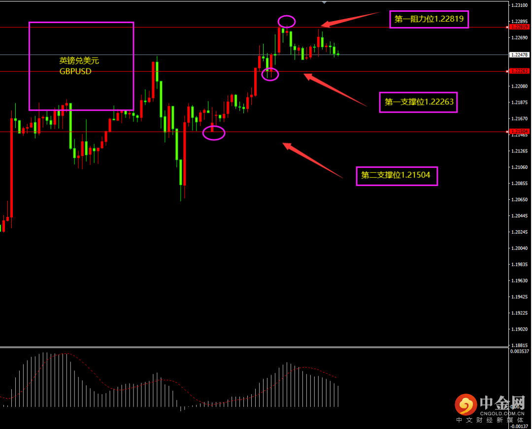 天图英镑收大阳线,价格继续冲高,上方多空博弈多头获胜,短期MACD逐渐上移,空头力度有所减弱,日内更多以逢低看多为主?小时图英镑期间连续阳线拉升,MACD位于0轴之上,多头占优,短期上方有部分阴线回落,但力度较弱,更多视为调整,调整之后继续以逢低看多为主。