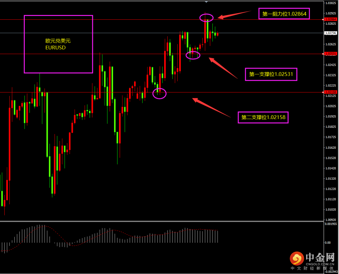 天图欧元收阳线,价格继续冲高,突破前期震荡高位,多头力度仍然强劲,短期MACD逐渐上移,空头力度有所减弱,日内更多以逢低看多为主?小时图欧元期间连续阳线拉升,MACD位于0轴之上,多头占优,短期上方有部分阴线回落,更多视为调整,调整之后继续以逢低看多为主?