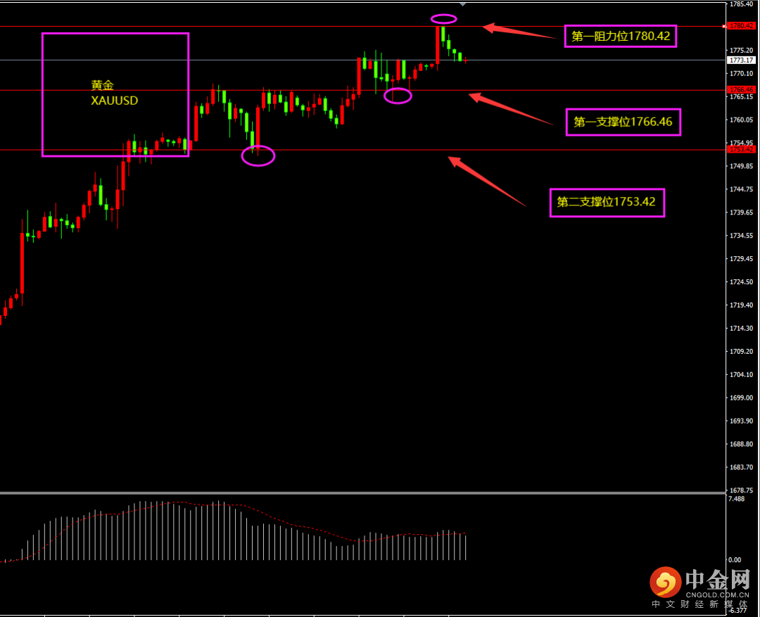 天图黄金收阳线,价格再度冲高,多头有所增强,短期MACD逐渐上移,空头持续减弱,但连续冲高后或面临调整,日内更多以震荡以及带有一丝上行为主。小时图黄金期间价格创新高,而MACD能量未创新高,形成顶背离,短期上方有连续阴线回落,空头仍在,日内以震荡带有一丝上行为主?(有回落风险)
