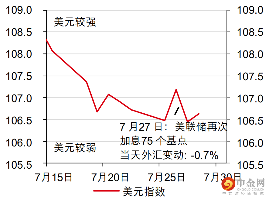 例如,正如普遍预期,美联储在7月26-27日的会议上再次加息75个基点,但美元反而小幅走软。然而,美元在一天后企稳(图1),这表明以下利空美元的推定似乎为时过早:美联储正在转变政策。我们认为,考虑到美联储的最新指引,外汇市场可能会对经济数据的中短期变化更加敏感。我们认为,经济数据将继续推动美元走强,因为通胀数据足以支持美联储继续加息,直至达到限制性政策立场,而经济活动放缓可能会导致经济衰退风险继续发酵,令“避险”美元从中受益。