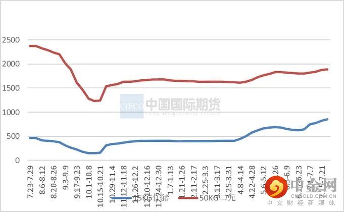 从供需关系来看,供应减少驱动的上涨已经充分反映到猪价里了,后面猪价就是供给和需求的博弈了。若8月消费好转,可能会有一些提前一些在9月之后压栏和二次育肥的猪出现提前增重,8月价高同时透支后面涨幅;若8月消费一般甚至更加疲软,则是远月利好更多,初步可看到24-26元/公斤。