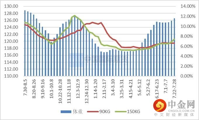 上周全国出栏平均体重126.58公斤,较前一周涨0.56%,150公斤以上出栏占比7.42%,增加0.58%;90公斤以下占比6.63%,持平。上周出栏均重继续小幅上涨,北方市场二次育肥陆续出栏,且前期集团场出栏体重均有不同程度增加,南方受雨水影响一般,小体重提前出栏现象较少,预计下周体重窄幅变动。