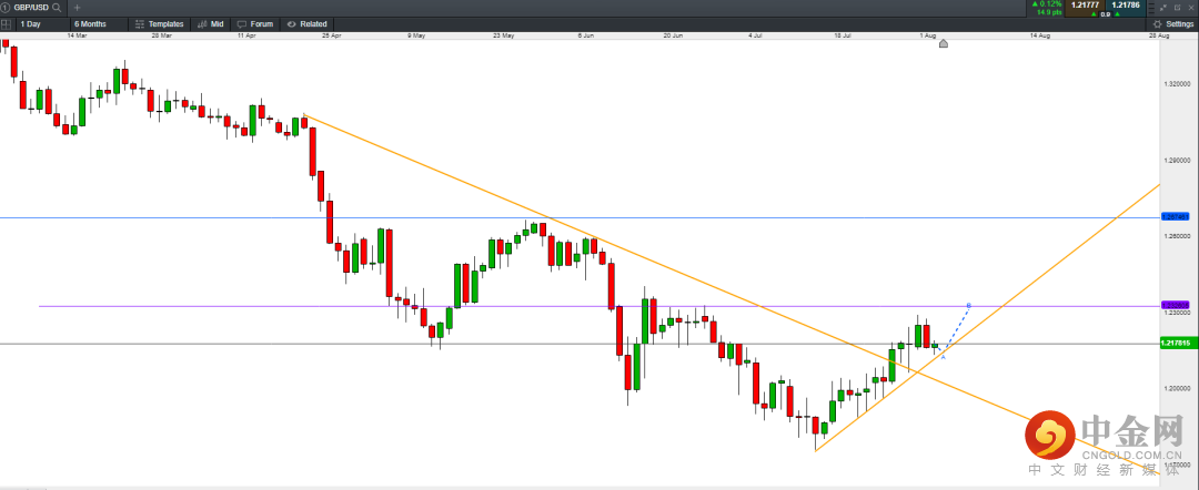 日线级别,英镑兑美元反弹突破下行趋势线压力,并且回测支撑有效,多头可能挑战1.233附近的阻力。若成功突破则形成“U”型底部,价格或进一步向上延伸。