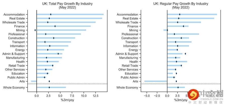 更重要的是,最近的工资增长似乎具有相当广泛的基础,增加了英国央行对持续通胀压力的担忧。目前英国几乎所有部门的工资增长都远高于历史平均水平。这种广泛的薪酬压力源于英国劳动力市场的紧缩,职位空缺接近历史新高,职位空缺数量超过失业人数。