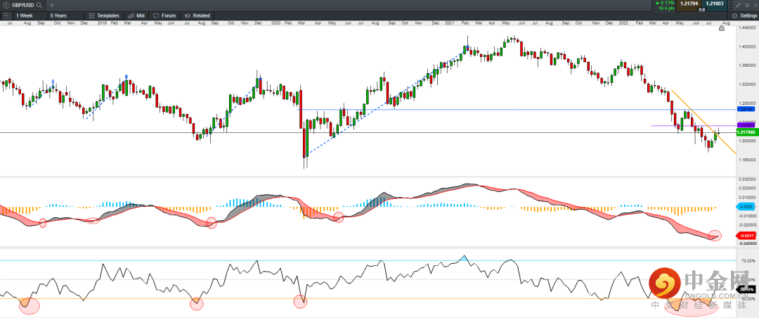 周线级别来看,MACD指标与RSI指标都出现明显的底背离,而根据以往的走势来看,都呈现不同程度的反弹,因此,英镑可能仍具有一定程度的反弹空间。中期的反弹目标可参考1.2675。
