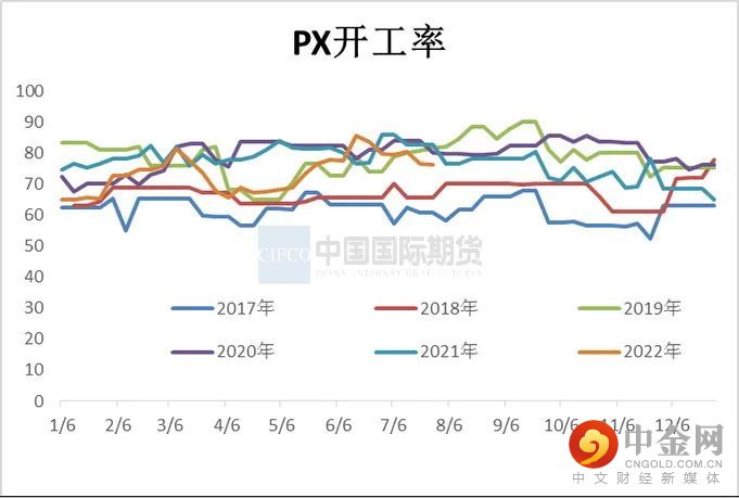 7月内PX市场整体呈现向下趋势。本月CFR中国月均价为1102.83美元/吨,环比上涨5.16%。韩国SOIL77万吨PX装置提前检修于5.20检修至7月底。7月国内PX开工率下降3.57%,PX装置平均开工率78.18%。供应端来看,国内PX供应出现一定走弱,月内除福建2套PX装置6月底进入检修外,还有扬子石化前期检修装置重启后再度停车,多套PX装置因原料及加工差压缩的问题出现降负。
