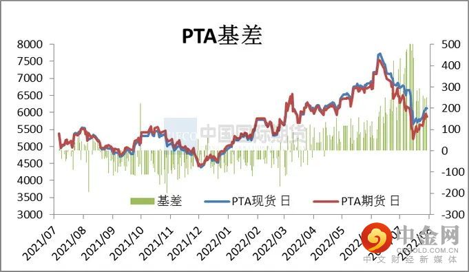 7月PTA基差走弱,中下旬PTA主力供应商出售现货,下游企业采购热情不高,PTA现货基差走弱,现货流通量有所增加。