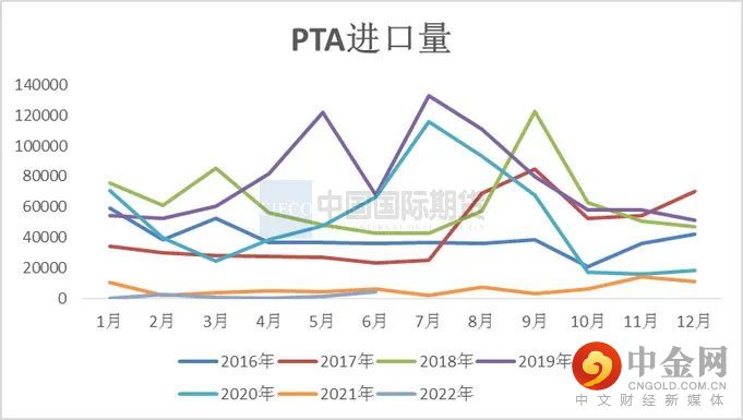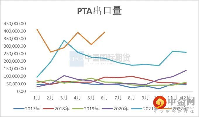 2022年6月PTA进口量为0.42万吨,环比增184%。2022年1-6月PTA累计进口量0.93万吨,同比下降71%。下半年来看,国内供需压力仍存,特别是四季度随着PTA新增产能陆续兑现,过剩压力或将更加明显,中国PTA价格在全球仍有价格优势,但随着海外需求减弱,后期PTA进口量或呈现缩减状态。