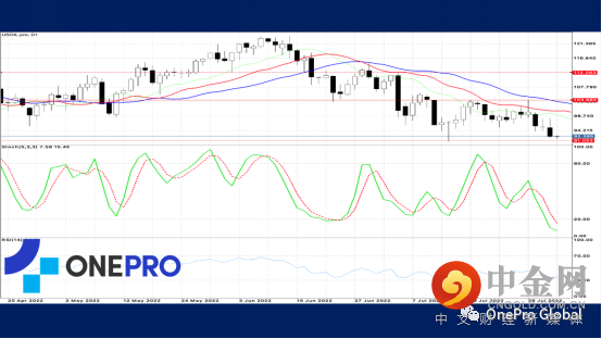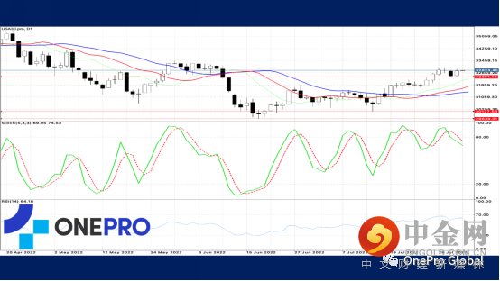 道琼指数的日线技术指标中,Alligator呈现黄金交叉,而短线的KD却是从高档钝化区脱离变成死亡交叉,表示短线的上涨受到阻力,短期行情走入盘整阶段,投资人不适合过度放大资金进场。