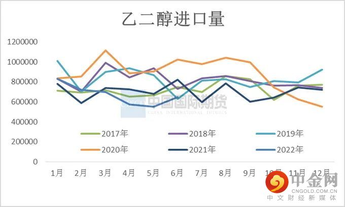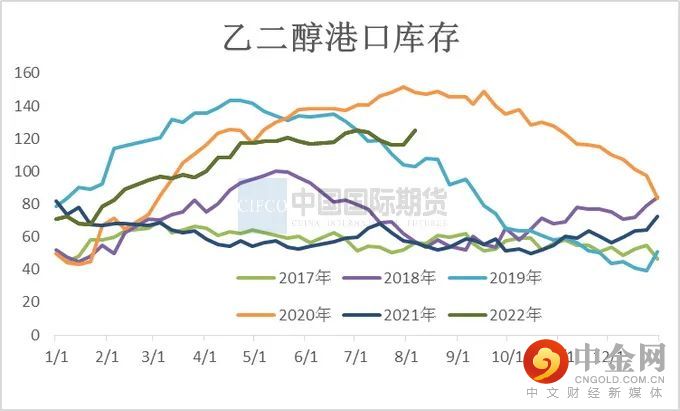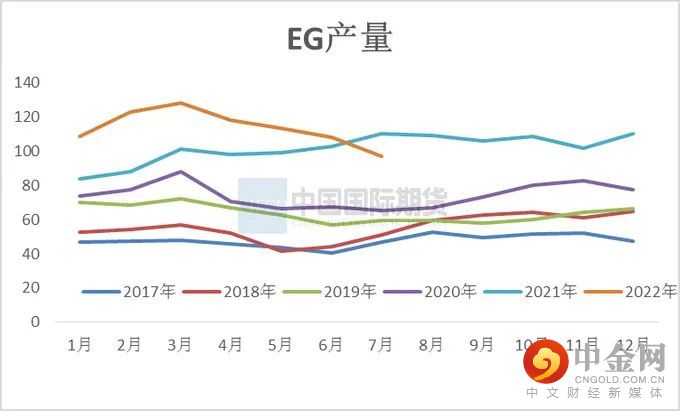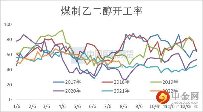 近五年来国内乙二醇产能保持较高增长速度,特别在2021年国内乙二醇产能增速为29.43%,截止6月份乙二醇总产能为2259.5万吨,煤制乙二醇总产能为865万吨。随着检修季到来以及煤制效益压缩,煤制乙二醇装置检修逐步落实,7月起煤制负荷回落明显,7月煤制乙二醇开工率为48.9%,较上月下降0.6%。7月煤制负荷小幅震荡整理后,进入8月即将开启新一轮集中检修。新疆广汇40万吨、陕西延长10万吨、 新杭能源40