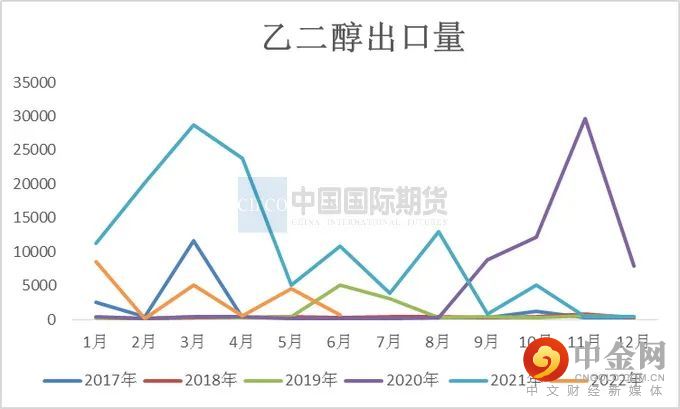 出口方面,1-6月份乙二醇出口量为1.96万吨,较去年同期减少8.04万吨,累计出口量比去年同期降80.38%。其中1月份出口量最高,为8543吨,2月份出口量最少,为209吨。
