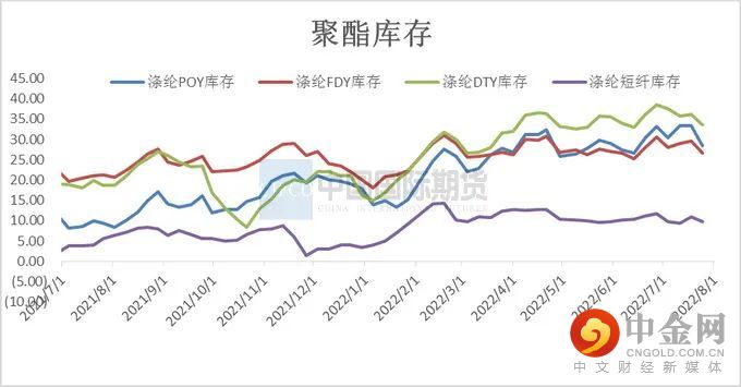 7月底长丝库存压力小幅回落,但绝对水平仍高,POY库存天数28.5天、FDY库存天数26.6天、DTY库存天数33.5天。产品库存依然逼近年内高位,7月中下旬,聚酯下游集中补货,聚酯企业去库存相对明显,平均去库存4-5天,个别企业去库存力度较大能达到10天,下游本身原料备货已处于极低水平,存在较大的刚需补货需求。