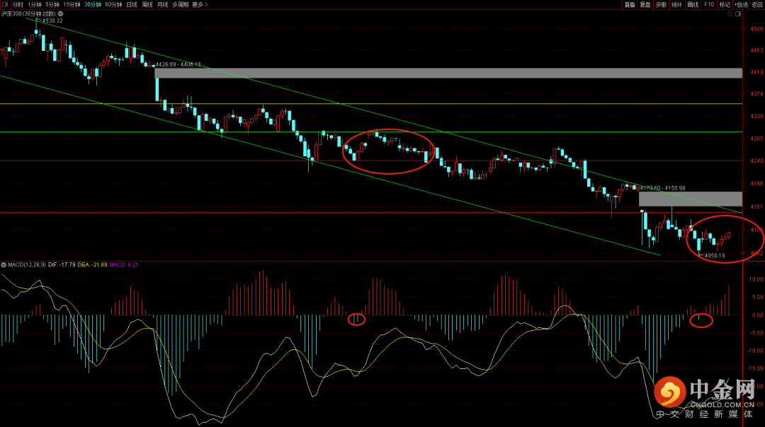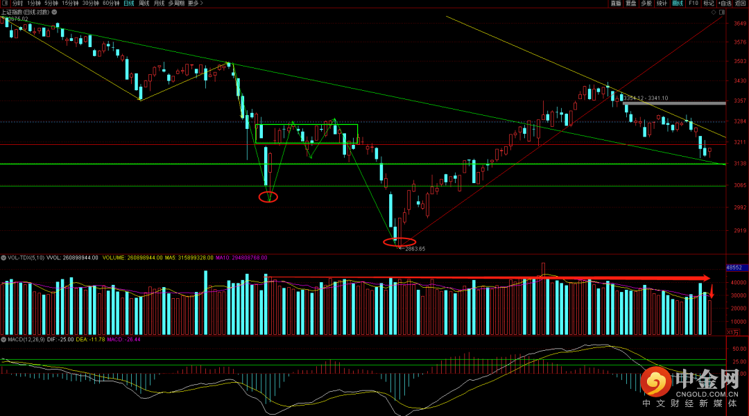 大盘跳空高开,量能呈现萎缩态势,出现回补缺口走势,短期从周期看还需要一周左右的调整时间,注意观察筑底结构是否完整,一旦结构完整大概率会有向上去挑战下降趋势线的压制。一旦突破有望重新挑战3308点压制。