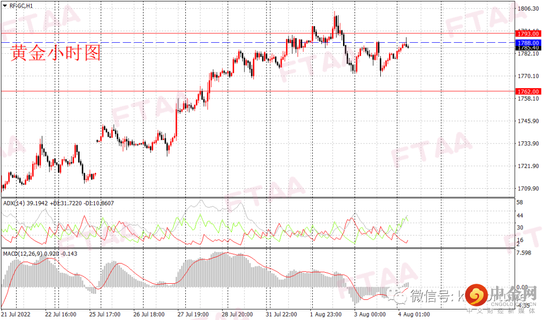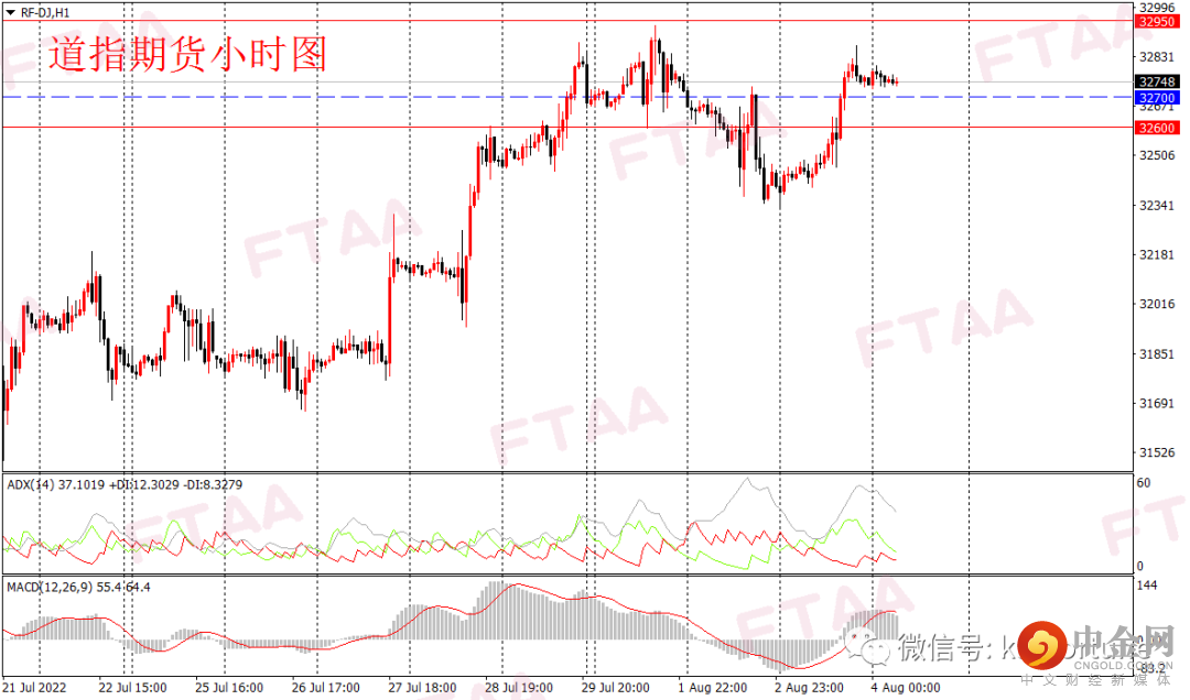 周三美股三大指数集体上涨,纳指涨超2.5%,道指涨416点或1.29%。美国公布的7月ISM服务业指数意外升至三个月新高,商业活动和新订单向好,缓和了市场对更大范围经济下滑的顾虑。同时市场继续预期企业财报向好。道指高开震荡走高,日图收出跳空中阳,显示短期多头发力,日图级别维持偏多。道指期货方面,昨日亚盘震荡后,欧盘后段和美盘早盘持续拉升。小时图ADX指标高位,MACD指标翻红,短线或维持强势。今早亚盘道指期货窄幅震荡,操作上可逢低在32700附近轻仓多,止损32600,目标32950。