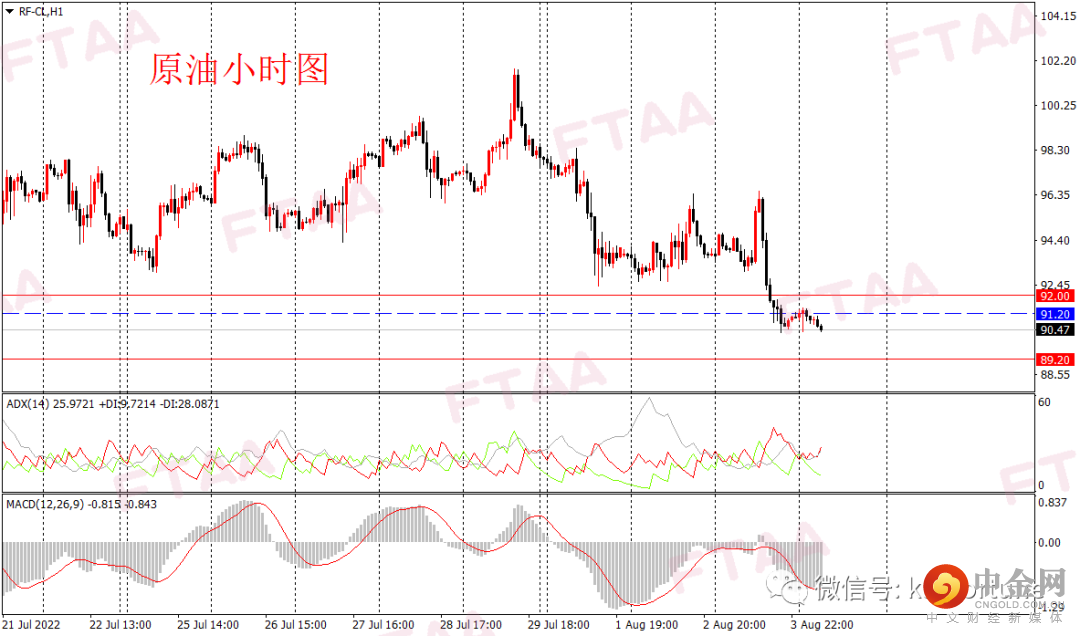 原油周三延续下跌,最高96.54,最低90.38,日图收出长上影中阴,显示短期多头一度发力,但空头继续占优。收盘短期新低,日图级别延续偏空。小时图看,昨日亚盘震荡后,欧盘时段一度拉升,但美盘时段大幅回落。沙特欧佩克+仅同意9月最小幅度增产,但未能提振油价。短线或维持弱势。今早亚盘油价小幅回落,操作上可持有空单,或逢高在91.20附近轻仓空,止损92,目标89.20。