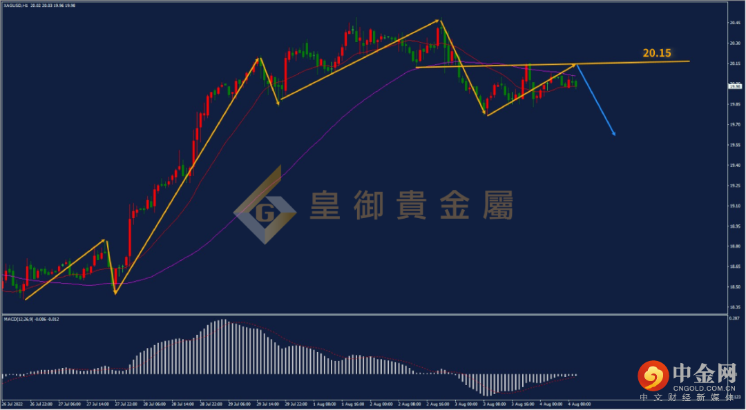 从白银1H周期图看,自本周最高触及20.49下跌以来,形态上类似于黄金,昨天的反弹一直受压于MA60,走势明显较弱。如果下午时机动未能进入0轴上方,则空单动能会逐渐走强。结合4小时周期看,形态上类似于黄金,但比黄金弱,MA21均线开始拐头向下,并且MACD动能开始明显减弱,代表近期还会持续陷入震荡下行。综合以上周期考虑,日内建议高空为主。美盘之前可以关注重要阻力位20.15附近,如果在此受阻,可以考虑尝试布局空单。