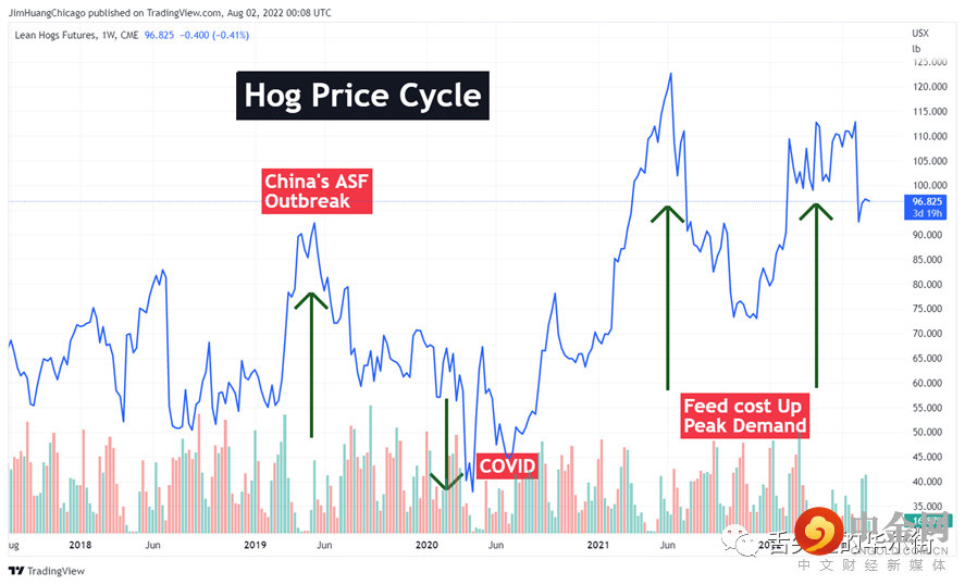 首先是猪周期。今年的高价将使明年供应增加,猪价下跌。其次,随着恶性通胀和即将到来的衰退,生猪需求将出现替代效应。消费者会选择低价的动物蛋白,比如鸡肉,同时减少猪肉需求。最后,中国生猪供应增加,猪肉进口减少是利空美猪的一大因素。