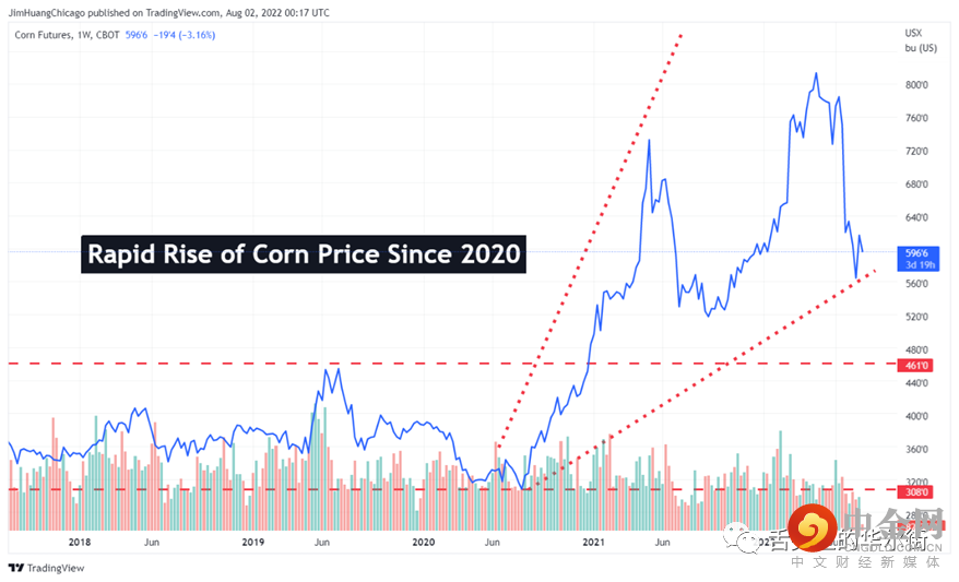 我们可以进一步研究玉米价格走势。玉米期货的价格通常为每蒲式耳3美元至4.50美元,但在2021年5月飙升至7美元。今年4月,它再次打破记录达到每蒲式耳8美元。我预计玉米价格会下跌,但仍高于去年的水平。