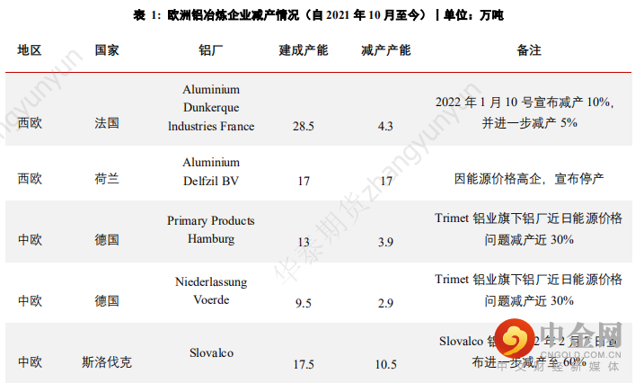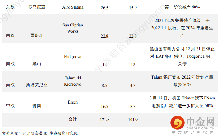 2021年下半年以来,欧洲风电和核电供应不济,加之因和俄罗斯政治关系紧张,天然气供应不足,致使能源价格多次飙升,欧洲铝冶炼商纷纷减产。进入2022年,欧洲能源危机仍存,目前已有约100万吨电解铝产能受到影响,约占全球产能1.3%。