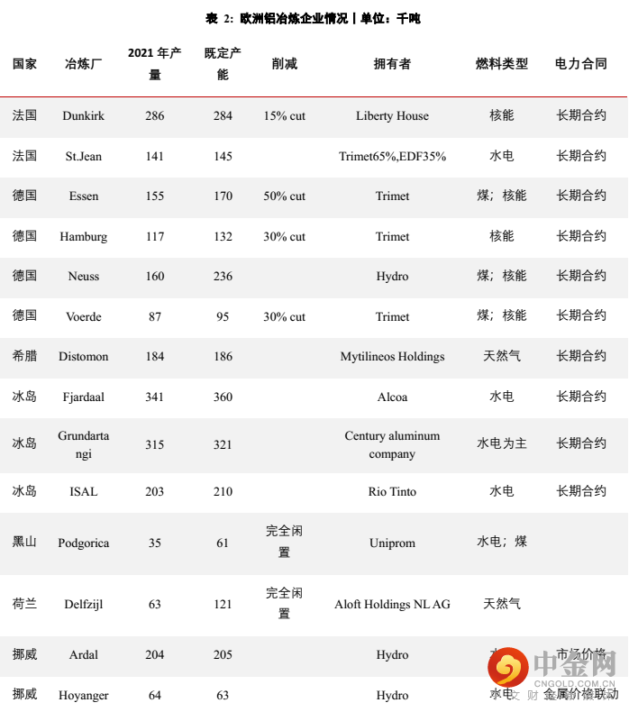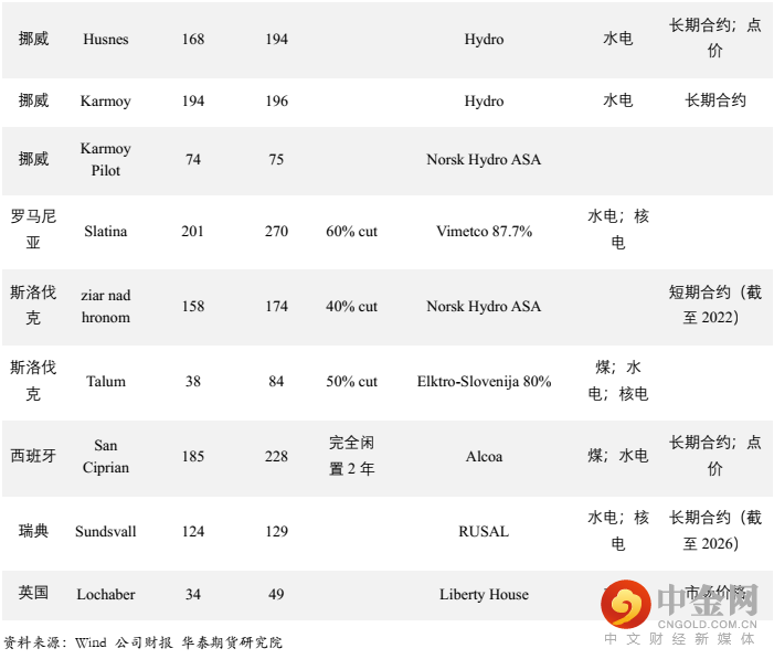 由于目前对于海外电解铝供应端最关心的问题仍然是,在海外高能源成本之下,欧洲铝厂有没有可能扩大减产。因此,对欧洲(除俄罗斯)的企业用电情况和产能做了梳理。