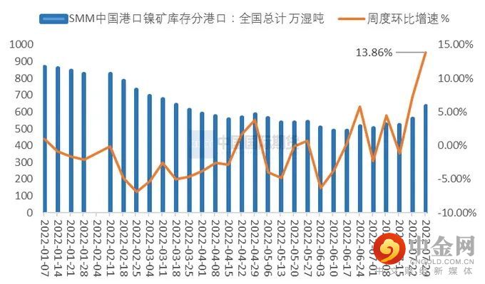 镍矿港口库存出现累库,周度环比上升明显。截止7月29日,SMM数据显示,国内港口镍矿库存635.86万吨,周度环比增加13.86%,与6月底相比,增加了23.15%。