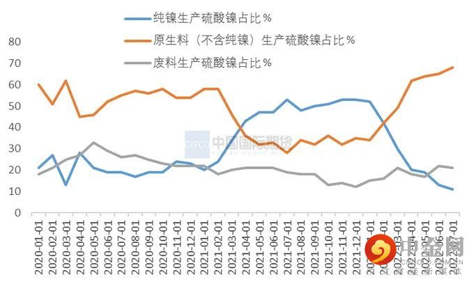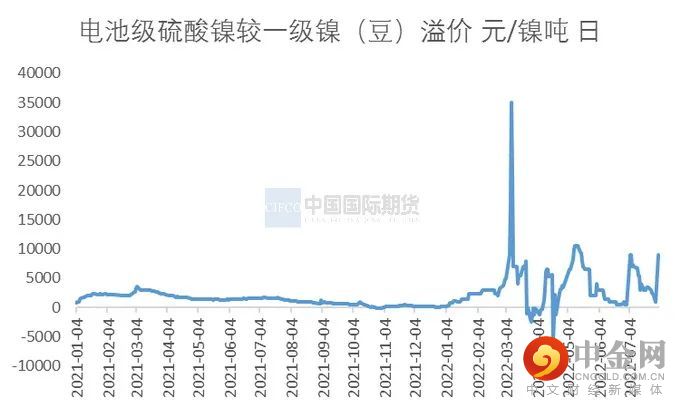 呈现供需双旺格局,硫酸镍对纯镍的需求进一步下降。SMM数据显示,2022年7月全国硫酸镍产量13.11万吨,环比增加6.71%,同比增19.09%。进口方面,为硫酸镍提供原料的中间品进口量大增,其中,镍湿法冶炼中间品6月进口量96449吨,同比增长220.65%;镍锍6月进口量17774吨,环比增加82.5%,同比增加4445.78%。根据SMM数据显示,7月硫酸镍的原料占比如下:镍豆镍粉等纯镍占比继续下降至11%,原生镍提升至68%,再生镍维持21%。纯镍的占比继续下降,被原生料,例如镍氧化镍钴、高冰镍等代替的越来越多,从对镍锍和湿法冶炼的中间品7月环比大增的情况看,这一短期趋势是呈现强化的。随着镍铁利润率的下降,高冰镍等对硫酸镍的支持会更明显,而纯镍对生产的作用在不断被削弱。