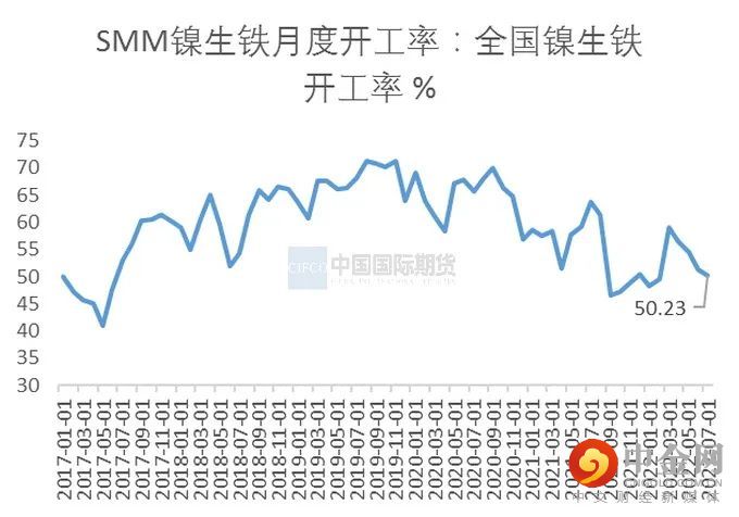 7月镍铁国内产量同比、环比均下降。SMM数据显示,2022年7月全国镍生铁产量为700860吨,同比下降21.86%,环比下降4.71%。印尼方面,7月的镍生铁月度产量达到14.35万镍吨,环比增加2万镍吨。