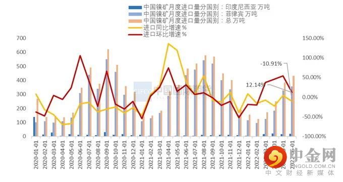 海关数据统计,2022年6月份,中国镍矿进口量为431.06万吨,环比增加12.14%;同比增加-10.91%。其中,自菲律宾进口镍矿量为355.9万吨,环比大幅增加28.9万吨,增幅8.84%,同比下降18.3%,同比延续下降势头,环比的增速也在减弱。自印尼进口镍矿量为18.93万吨,环比上月增加3.38吨。