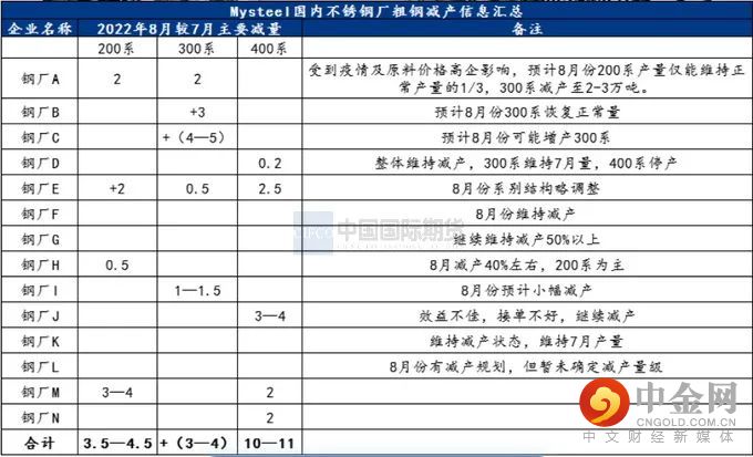 SMM调研,7月份全国32家不锈钢产量256万吨,较6月份产量环比下降3.03%,同比下降12.33%。中国和印尼300系产量合计131万吨,环比降3.68%。7月份不锈钢产量环比继续下降,特别是300系,印尼的产量也出现下降。这主要还在于不锈钢终端需求不佳,价格疲弱之下,生产亏损,因此维持了减产。从SMM统计的304冷轧利润来看,平均利润仍处于亏损状态,截止7月底,304冷轧利润率为-10.21%,相较于6月超过-14%以上亏损幅度有所收窄,其中主要是生产成本明显下移,这和镍铁价格不断走低有关。不过行业仍处于亏损阶段会继续抑制8月产量。消息面,8月份某华东不锈钢厂已经放出计划进一步减产,预计将比7月份粗钢减3.5万吨,300系等减幅不小,从MYSTEEL的不完全统计看,8月多数不锈钢厂维持了7月的减产力度。