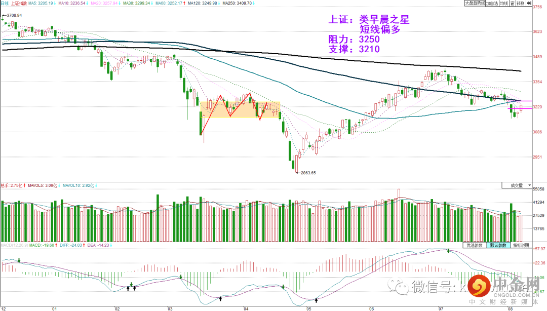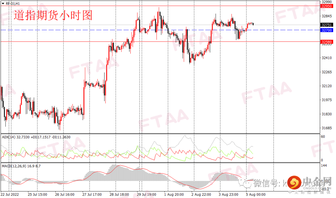 周四美股三大指数涨跌不一,纳指小涨,道指和标普微跌,其中道指跌85点或0.26%。市场在7月非农重磅数据公布前维持谨慎。道指低开窄幅震荡,日图收出小阴线,指数在年线关前持续整理,日图级别或有上破概率。道指期货方面,昨日亚欧盘震荡偏强,美盘时段下行,今早亚盘道指期货小幅上涨,考虑到现货指数形态偏多,道指期货操作上可逢低在32700附近轻仓多,止损32580,目标32950。