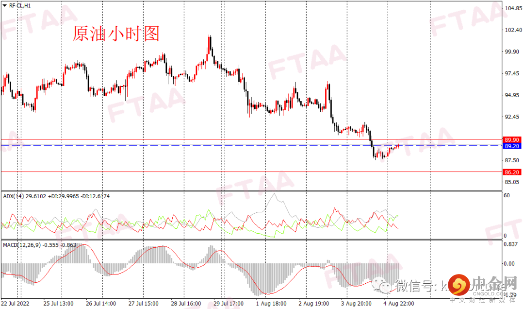 原油周四延续大跌,最高91.86,最低87.55,日图收出中阴线,显示短期空头继续主导,日图级别或延续跌势。消息面基本平静。油价昨日亚欧盘震荡,美盘开盘重新回落。当前ADX指标升至40以上,MACD指标绿盘运行,日内或延续震荡偏空。操作上可持有空单,或现价附近轻仓空,止损89.90,目标86.20。