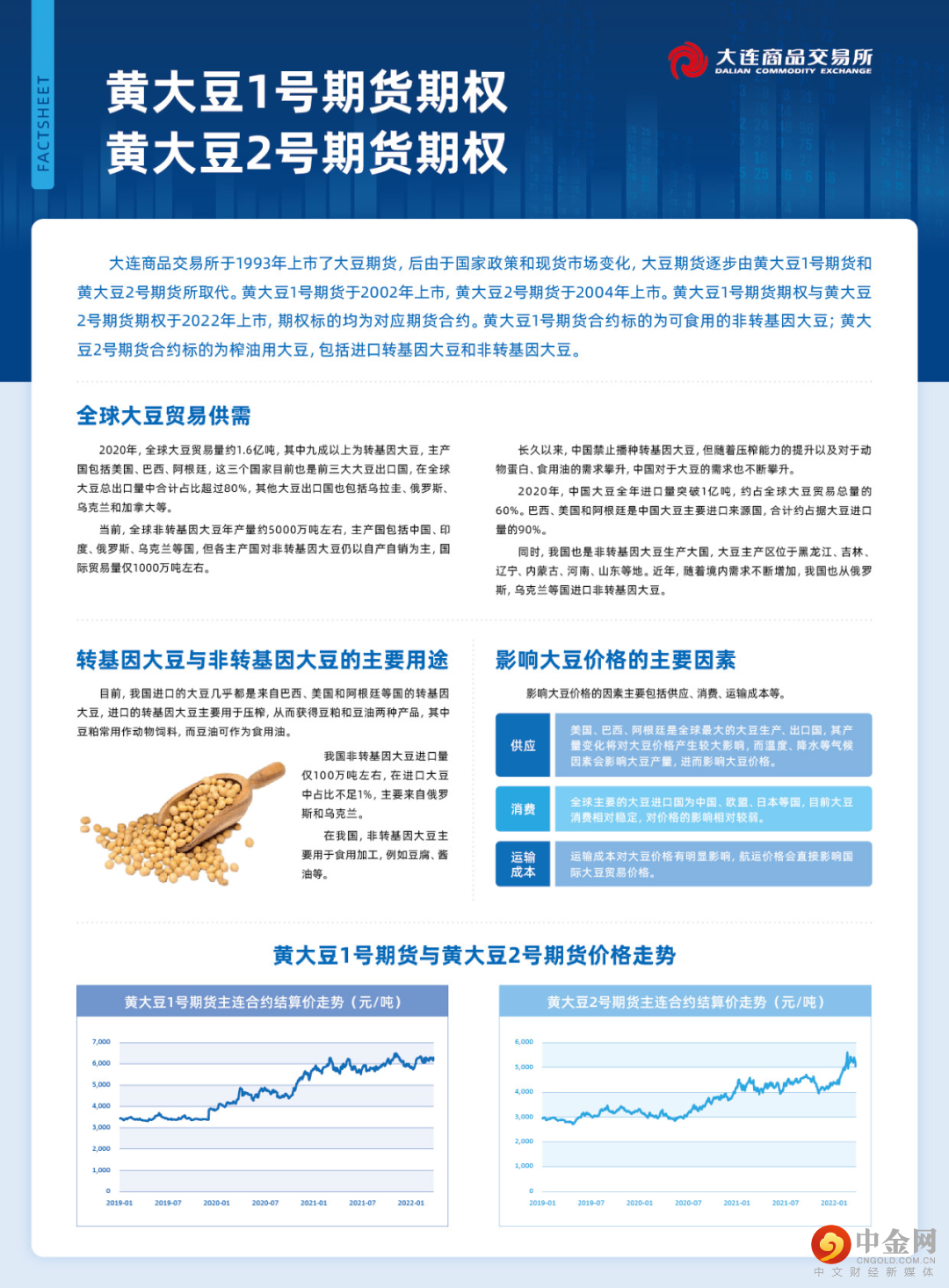 大连商品交易所于1993年上市了大豆期货,后由于国家政策和现货市场变化,大豆期货逐步由黄大豆1号期货和黄大豆2号期货所取代。黄大豆1号期货于2002年上市,黄大豆2号期货于2004年上市。2022年8月8日,
