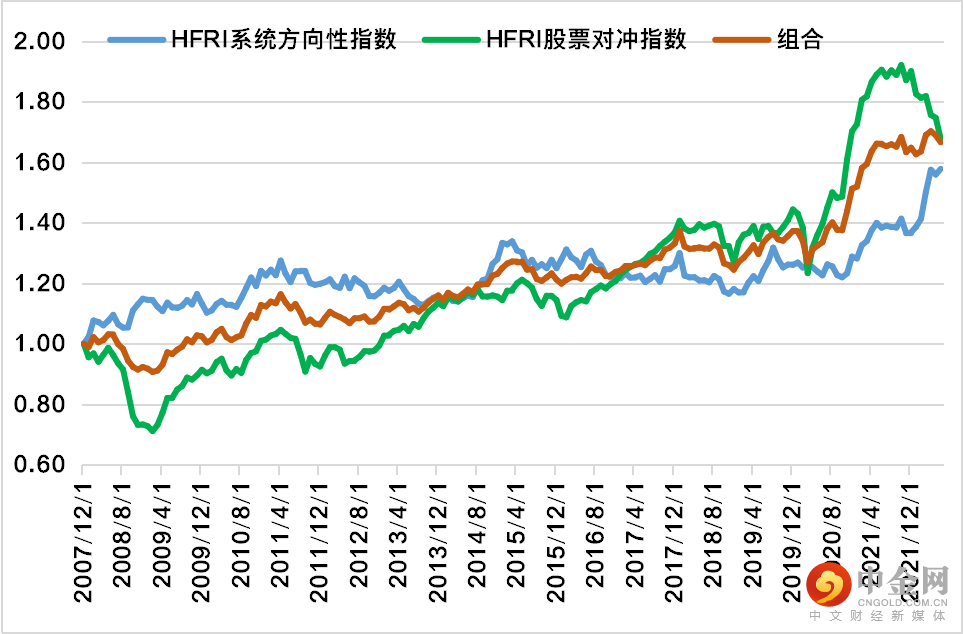举个例子,根据全球对冲基金研究中心(HFRI)过去14.5年的数据,我们将其中两个策略指数进行1:1组合,组合的整体收益率(67%)接近收益率最高的股票对冲指数(68%),而波动率明显低于该指数。波动率低意味着,即使从高点买入,亏损的可能性也会较低。