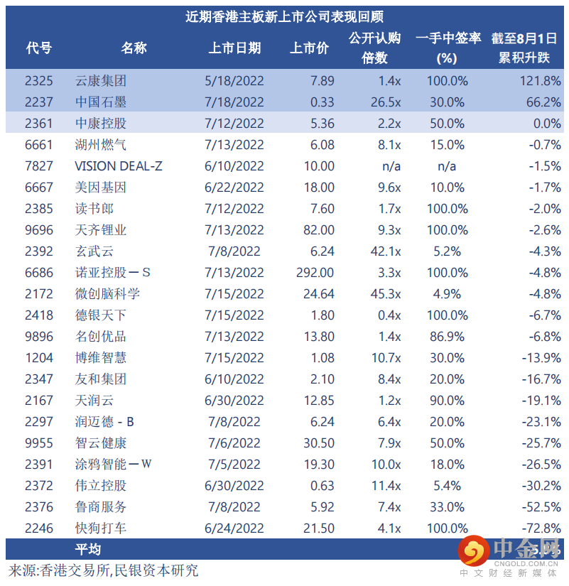 2022年7月一级市场表现疲弱,但月内却有16只新股上市,使7月份上市数目较今年上半年每月平均4.5只显着回升。可是,该16只新股截至2022年8月1日累积整体表现较平庸,只有1只新股累计上升及1只累计持平,分别是中国石墨和中康控股(2361 HK),其余14只累计报跌。该16只新股平均录得8.6%负回报。中康控股主要提供健康洞察解决方案,以解决医疗产品制造商客户的销售及营销需求,该等解决方案主要基于零售数据。根据报告,按于2021年的收入及于2020年所服务的顶级医疗产品制造商数目及企业级客户数目计,集团就中国健康洞察解决方案医疗产品及渠道分部而言排名第一。