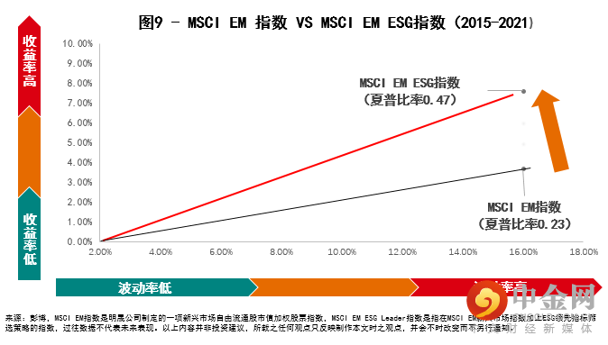 如图中所示,我们可以看到在2015至2021的7年时间中,MSCI新兴市场ESG领导者指数的复合年化收益率约为7.6%,是MSCI 新兴市场指数年化收益率的近2倍。因此,在波动率相近的情况下,加入ESG筛选策略的指数夏普比率也大幅提高。由此可见,ESG筛选策略应用在新兴市场投资中可获得更高的收益,并能大幅提升风险收益比,相较于世界市场整体而言,有效性更为明显。