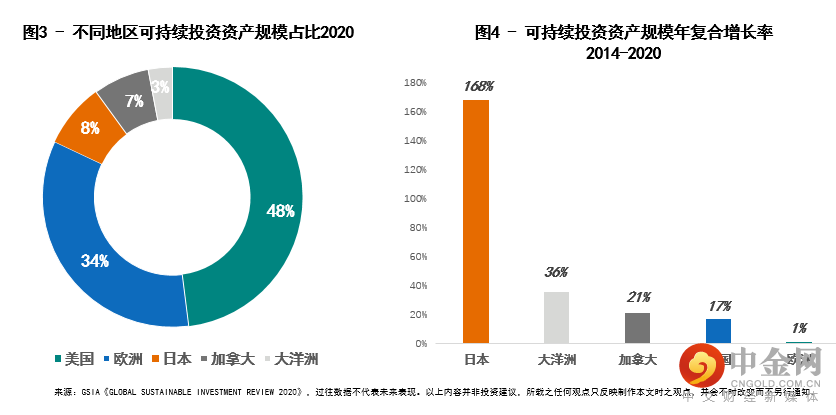 从世界范围内来看,近年来的ESG投资趋势也在不同地区呈现出不同的发展特点。从规模上来看,截至2020年美国和欧洲在五大主要地区中ESG投资的资产规模最大,分别以17万亿美元和12万亿美元占比48%和34%;而从ESG投资的发展速度来看,近几年之前ESG资产规模基数较小的日本、大洋洲和加拿大呈现出了更快的增长速度。