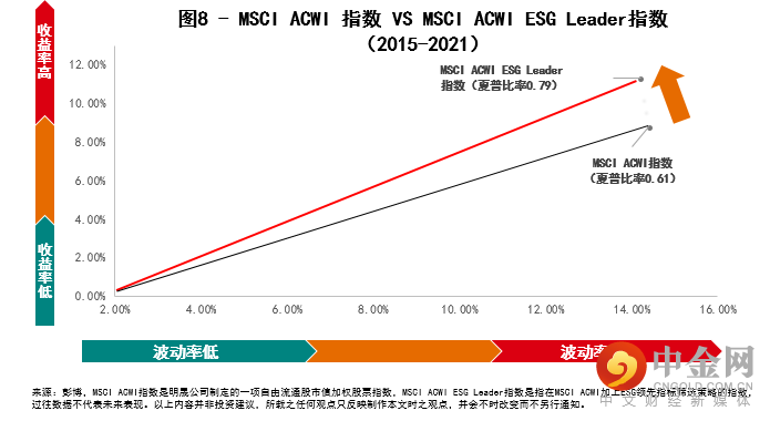 如图中所示,我们可以看到,在2015至2021的7年时间中,MSCI ACWI ESG指数的复合年化收益率约为11.3%,高于MSCI ACWI的8.8%。同时,前者的年化波动率为14.2%,也略低于MSCI ACWI指数的14.4%。而比较两者的夏普比率,可以看到MSCI ACWI ESG的夏普比率约为0.79,高于MSCI ACWI的0.61。由此可见,就全世界市场整体而言,加入ESG筛选策略的指数,相较于基准指数,在获得相对更高的收益同时可降低风险,从而获得更高的风险收益比。