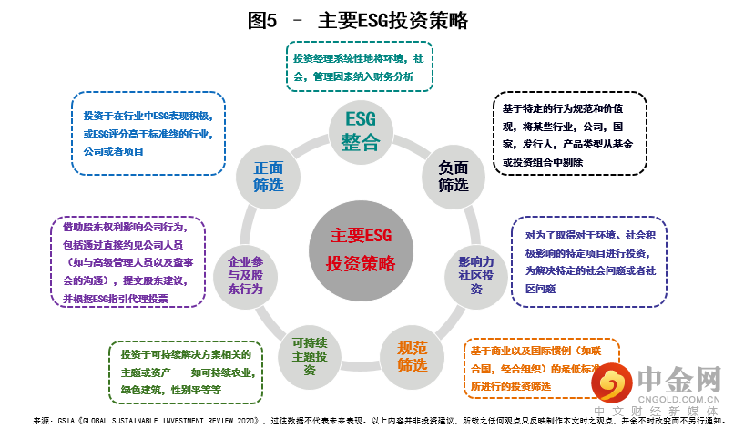 而从主流ESG投资策略的增长趋势来看,特定ESG投资策略越来越受到市场的追捧,主要ESG投资策略主要包括7大类,分别是:ESG整合、正面筛选、负面筛选、企业参与及股东行为、影响力/社区投资、可持续主题投资以及规范筛选。