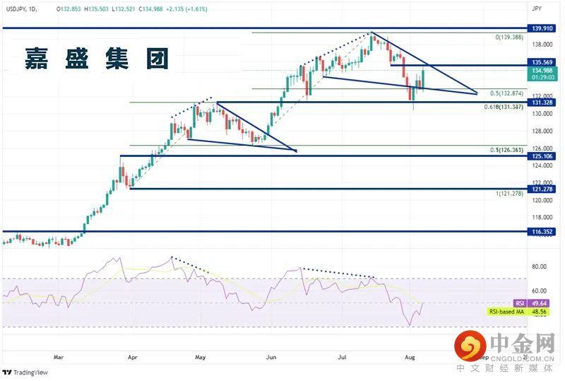 自从3月11日突破116.35,美元/日元持续大举上攻,5月9日最高到达131.33,当时RSI进入超买区域。该货币对之后盘整并形成下降楔形且回到3月31日低点到5月9日高点的50%回档位,RSI也回到中性区域。价格在5月31日上破下降楔形的上轨趋势线并再度冲高,于7月14日创下1998年以来最高点,RSI也再度超买。随后该货币对故伎重演,回撤并形成下降楔形且RSI回归中性,不同的是,这次价格击穿了50%回档位与下轨趋势线。美元/日元在8月1日跌至5月24日低点到7月14日高点行情的61.8%回档位,即131.33附近,并守于其上。价格在第二天反转且收盘回到楔形内,使得第一天的突破变成假性下破。美元/日元在8月5日非农就业数据发布后反弹200个基点,收于水平阻力位与楔形的上轨趋势线。预计价格将像5月那样击穿楔形上轨。如果本周美元继续反弹,可能带动美元/日元迅速回到139.39。