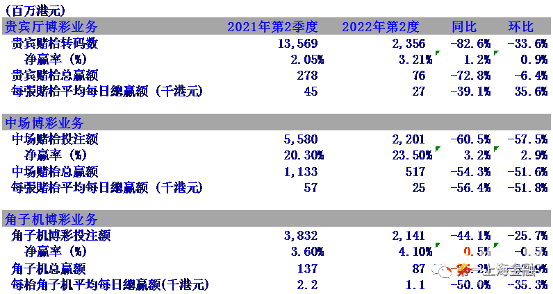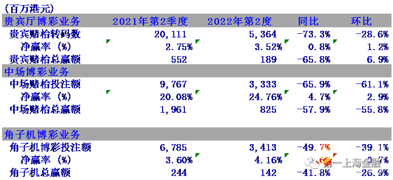 在博彩业务方面, 贵宾厅赌枱转码数为23.6亿港元, 同比减少82.6%, 环比下跌33.6%。净赢率为3.21%。贵宾赌枱总赢额分别同比和环比倒退72.8%和6.4%到0.8亿港元。中场赌枱投注额同比下跌60.5%, 环比减少57.5%到22.0亿港元。净赢率为23.5%。中场博彩总赢额为5.2亿港元, 同比下跌54.3%, 环比减少51.6%。 角子机博彩投注额为21.4亿港元, 同比减少44.1%, 环比减少25.7%。 角子机赢率为4.1%。角子机博彩赢额为0.87亿港元, 同比下跌36.2%, 环比减少33.9%。期内, 澳门美高梅设有294张赌枱及895部角子机。