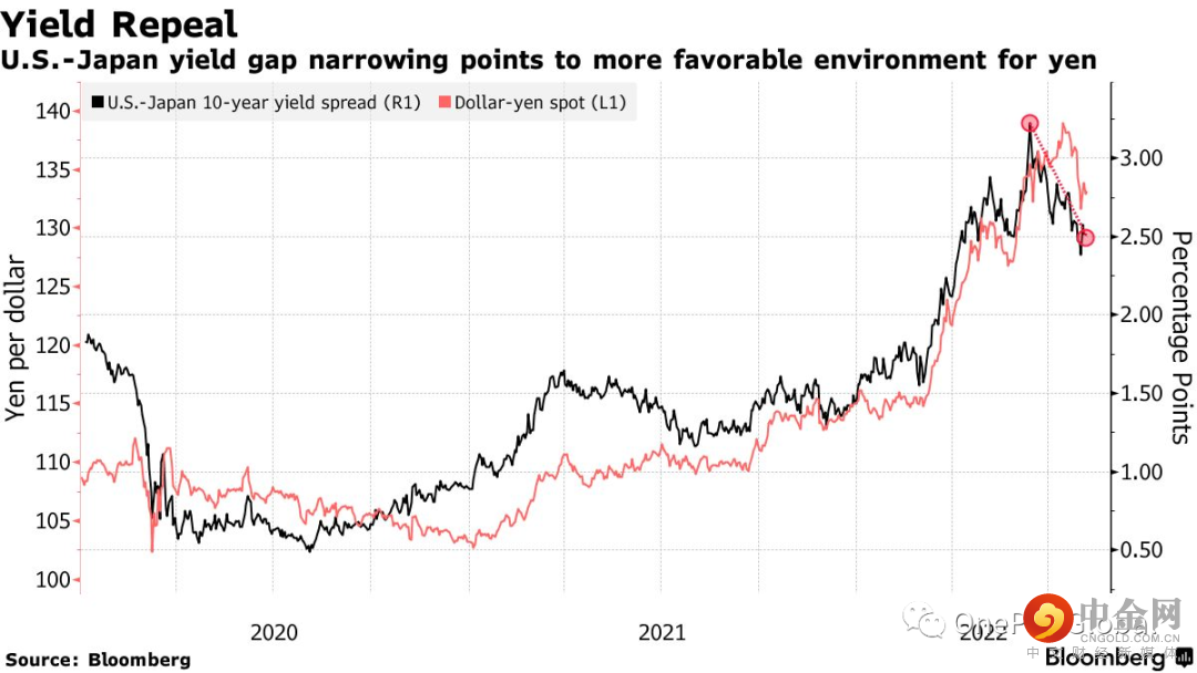 日元汇率与美债的走势密切相关。在美联储大幅加息下,日本央行仍将利率维持在最低水平,这对日本资产的相对吸引力构成压力。现在,随着交易员调整对美联储峰值利率的预测,并因担心美国经济放缓而重新考虑美债资产配置,美国国债收益率已从高位回落。