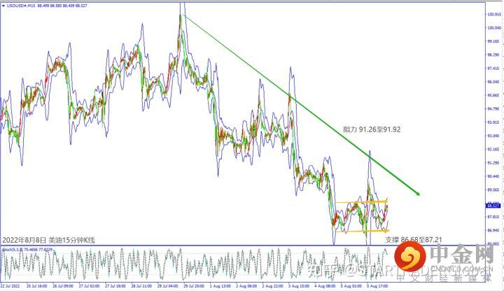 上周五(5日)美国公布经济数据利好,但是道琼斯和纳指出现两波300点的震荡走势,也让欧洲股指出现约1%震荡。受到美股一度大跌影响,美油价格掼破87关口。乌克兰扎波罗热核电站区域遭到炮击,地缘政治风险触动市场买盘,带动美油价格逆势上涨约4%。乌克兰国家核能公司表示没有发现辐射升高,美油价格再度回落至88美元附近整理。