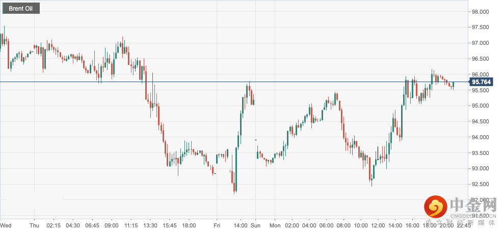 布伦特原油周一收盘小幅上涨后,今日开盘升至95.76附近,因受益于积极的经济数据提振,伴随俄乌地缘紧张局势持续为多头助力,使得油价获得上行空间。